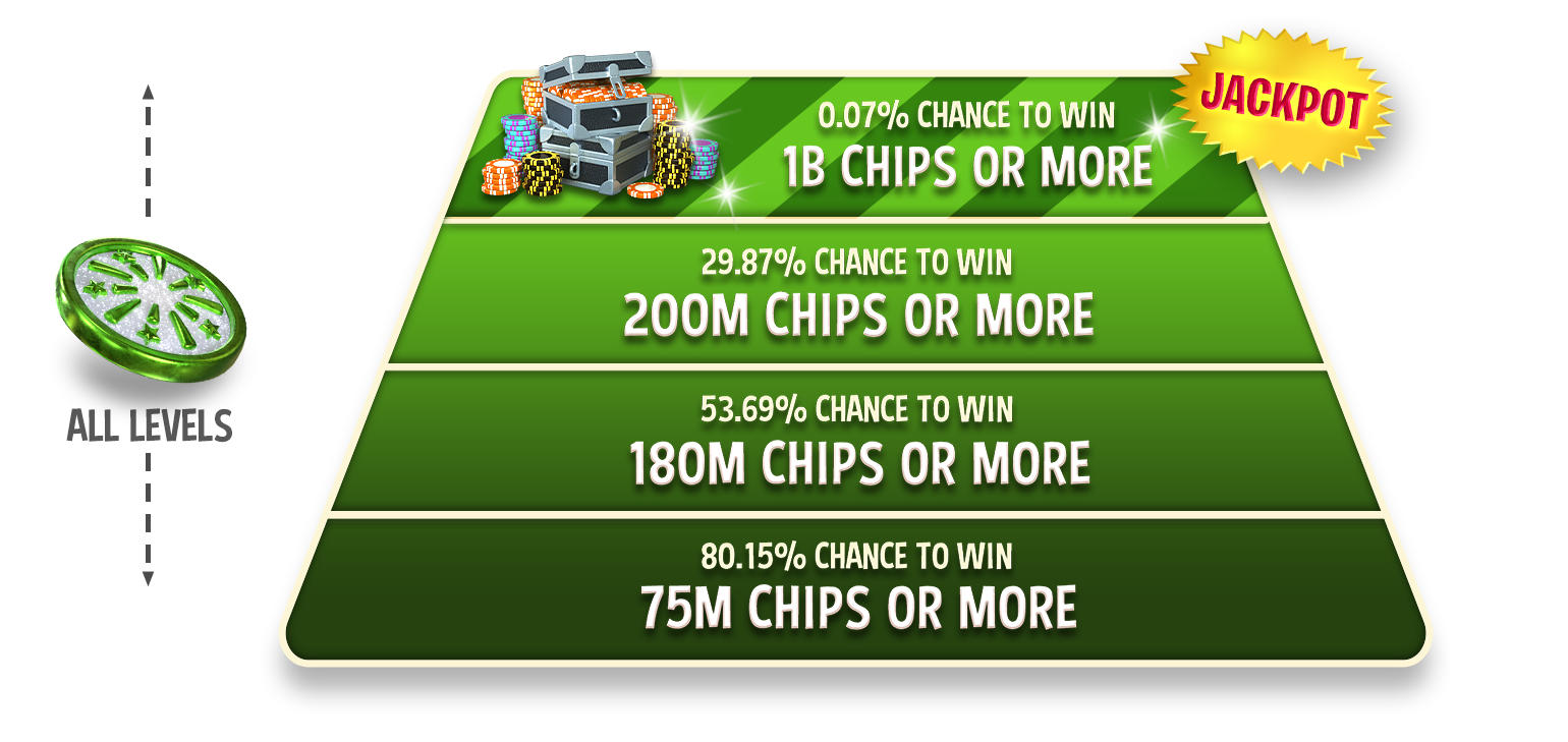 Dieser Spin ist einer der Spins mit den höchsten Gewinnen und ist nur für begrenzte Zeit erhältlich. Bei diesem Spin beträgt der Mindestgewinn 120 MILLIONEN CHIPS und der Jackpot 75 MILLIARDEN CHIPS.