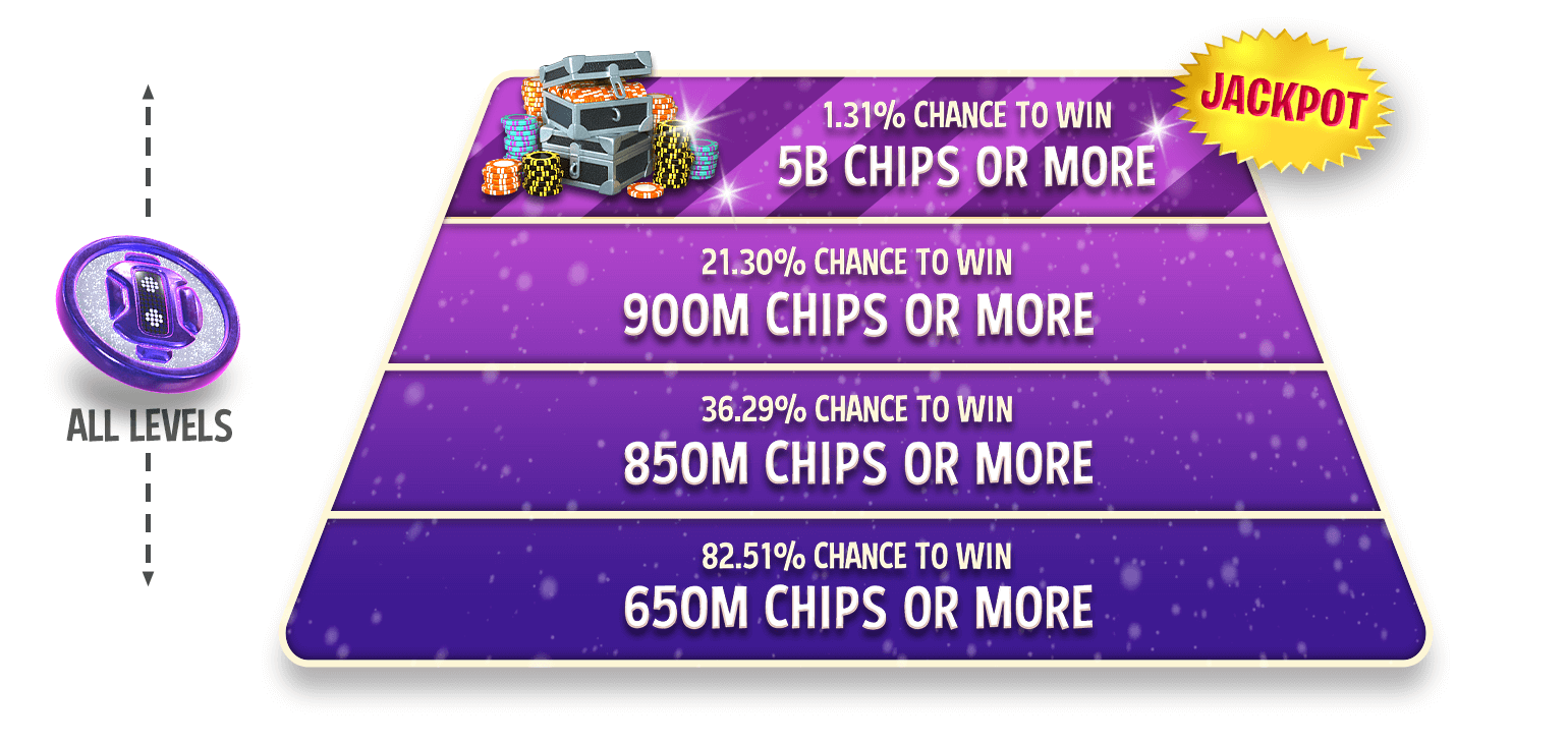 Dieser Spin ist einer der Spins mit den höchsten Gewinnen und ist nur für begrenzte Zeit erhältlich. Bei diesem Spin beträgt der Mindestgewinn 400 MILLIONEN CHIPS und der Jackpot 500 MILLIARDEN CHIPS.