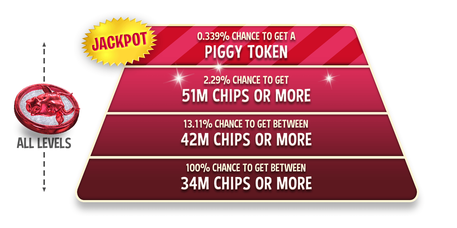 Dieser Spin ist einer der Spins mit den höchsten Gewinnen und ist nur für begrenzte Zeit erhältlich. Bei diesem Spin beträgt der Mindestgewinn 170 MILLIONEN CHIPS und der Jackpot 75 MILLIARDEN CHIPS.