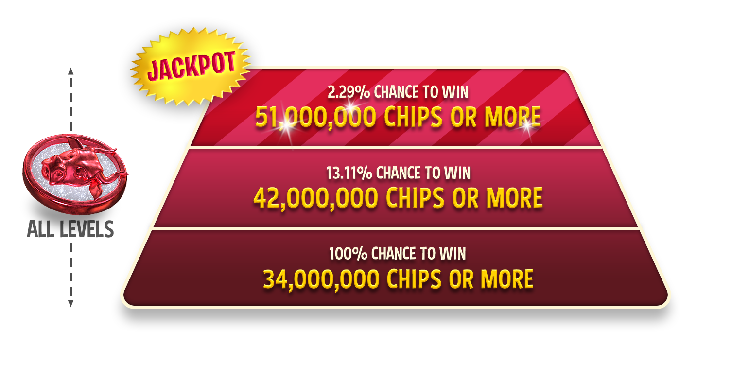Here is a list of the chip prizes you can win: 1.7M, 1.8M, 1.9M, 2M, 2.1M, 2.2M, 2.4M, 2.5M, 2.6M, 2.9M, 3.2M, 5.1M, 17M, 34M, 85M, 100M