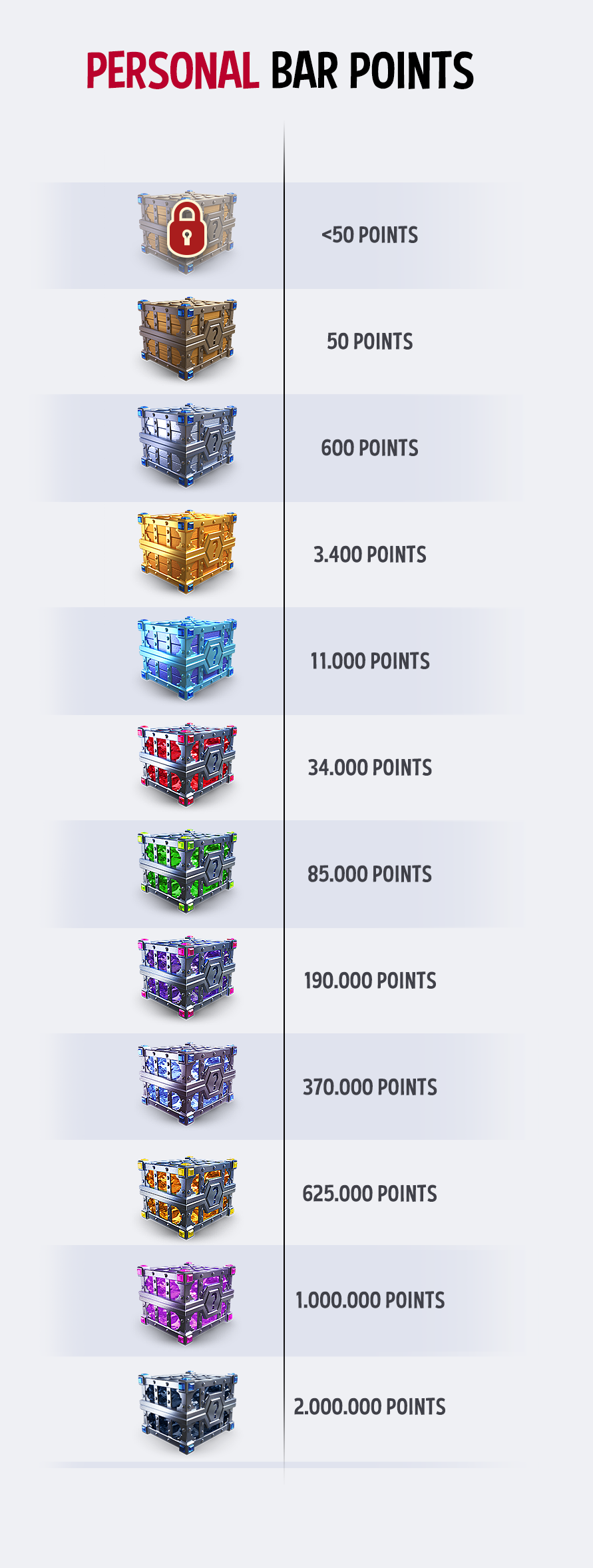 Cuando ganes Puntos de Equipo, también se llenará una Barra Personal. ¡La Barra Personal determina qué tipo de cofres conseguirás! Después de completar con éxito tu Barra Personal, ¡tus cofres suben de nivel! Hay 11 niveles de cofres:
