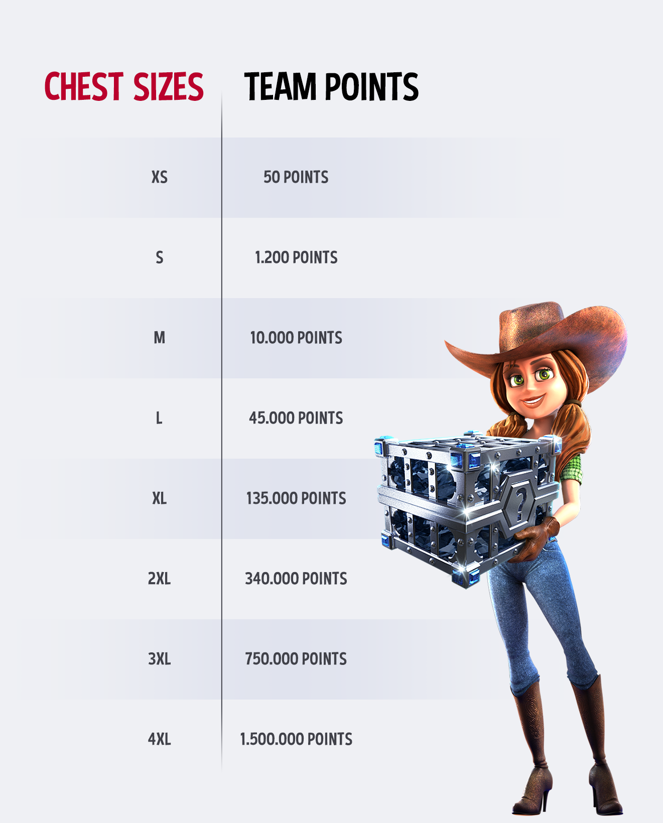 Quando si guadagnano Punti squadra, si riempie una Barra della squadra. La barra della squadra determina la dimensione del forziere che otterrai. Più Punti fornisci, migliori saranno i tuoi premi! Ci sono 8 scrigni: