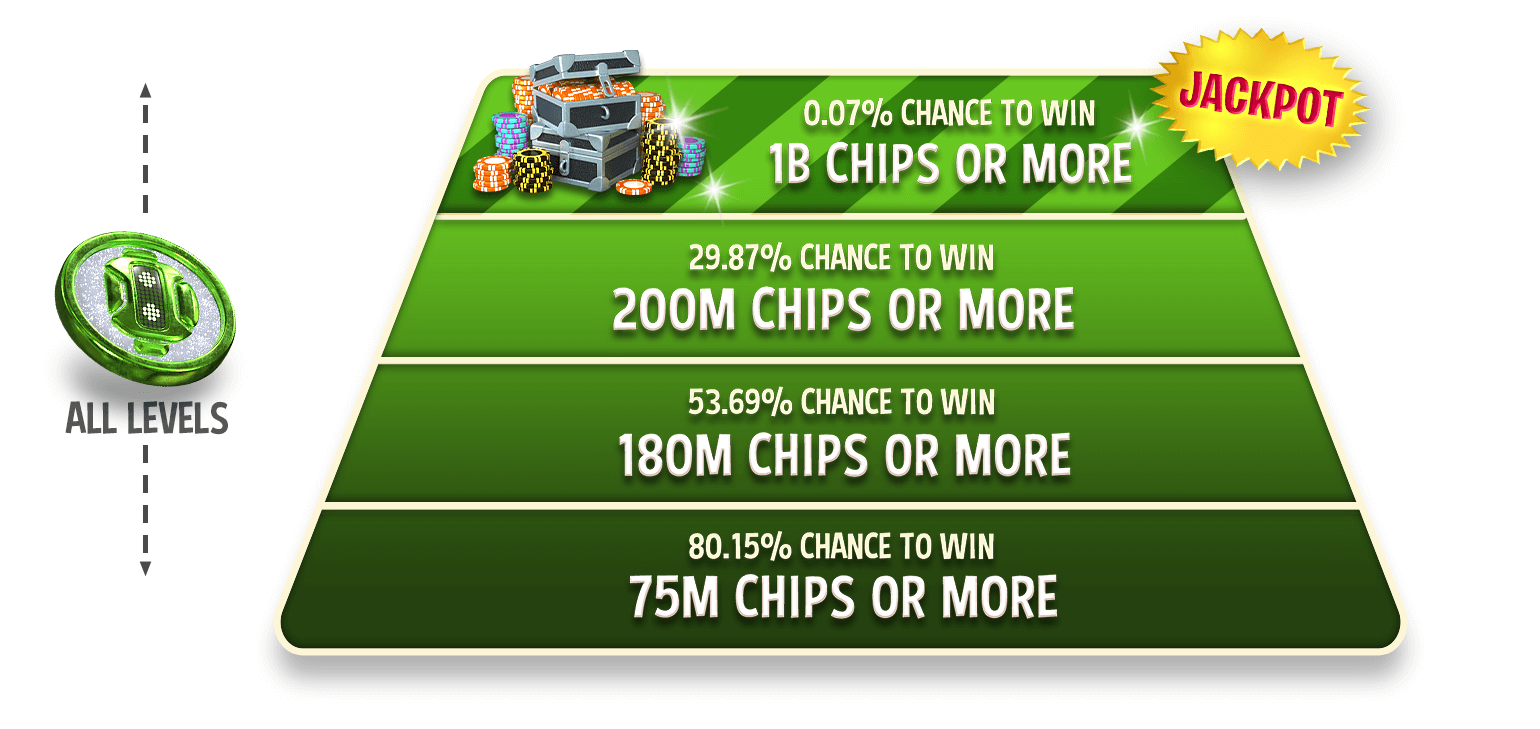 Ecco una lista dei premi in fiches che puoi vincere: 500K, 800K, 1M, 2M, 3M, 5M, 7M, 10M, 15M, 20M, 30M, 35M, 50M, 100M, 500M, 1B.