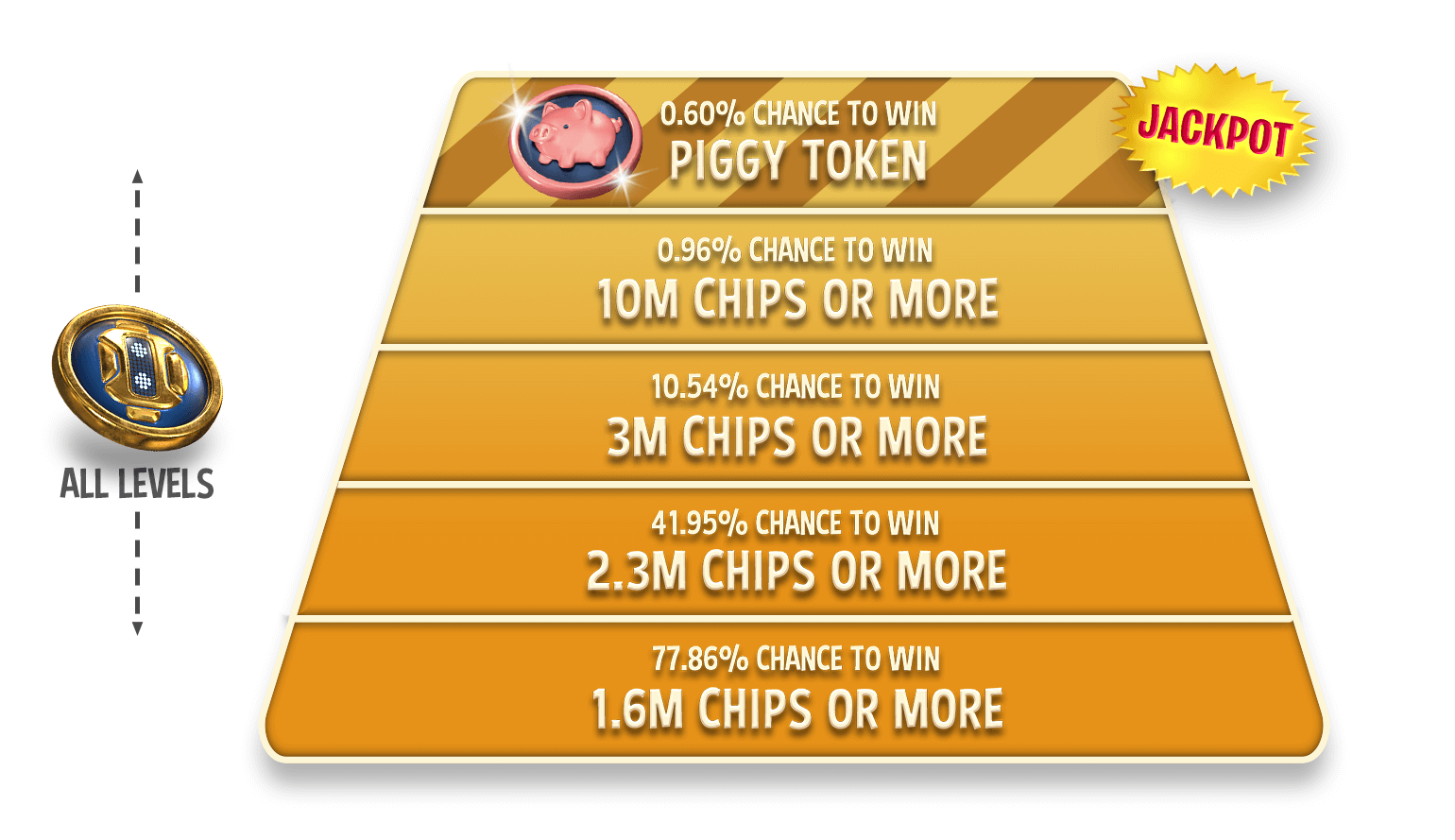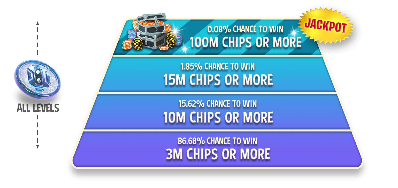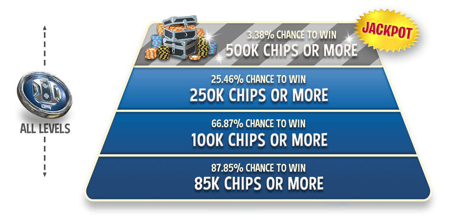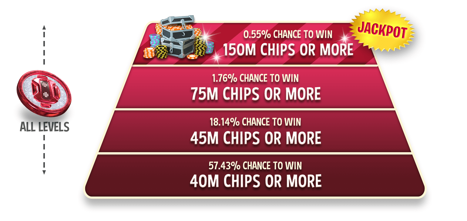 Ecco una lista dei premi in fiches che puoi vincere: 5K, 10K, 20K, 45K, 65K, 85K, 90K, 100K, 115K, 250K, 500K, 1M, 5M, 10M, 25M, 50M.