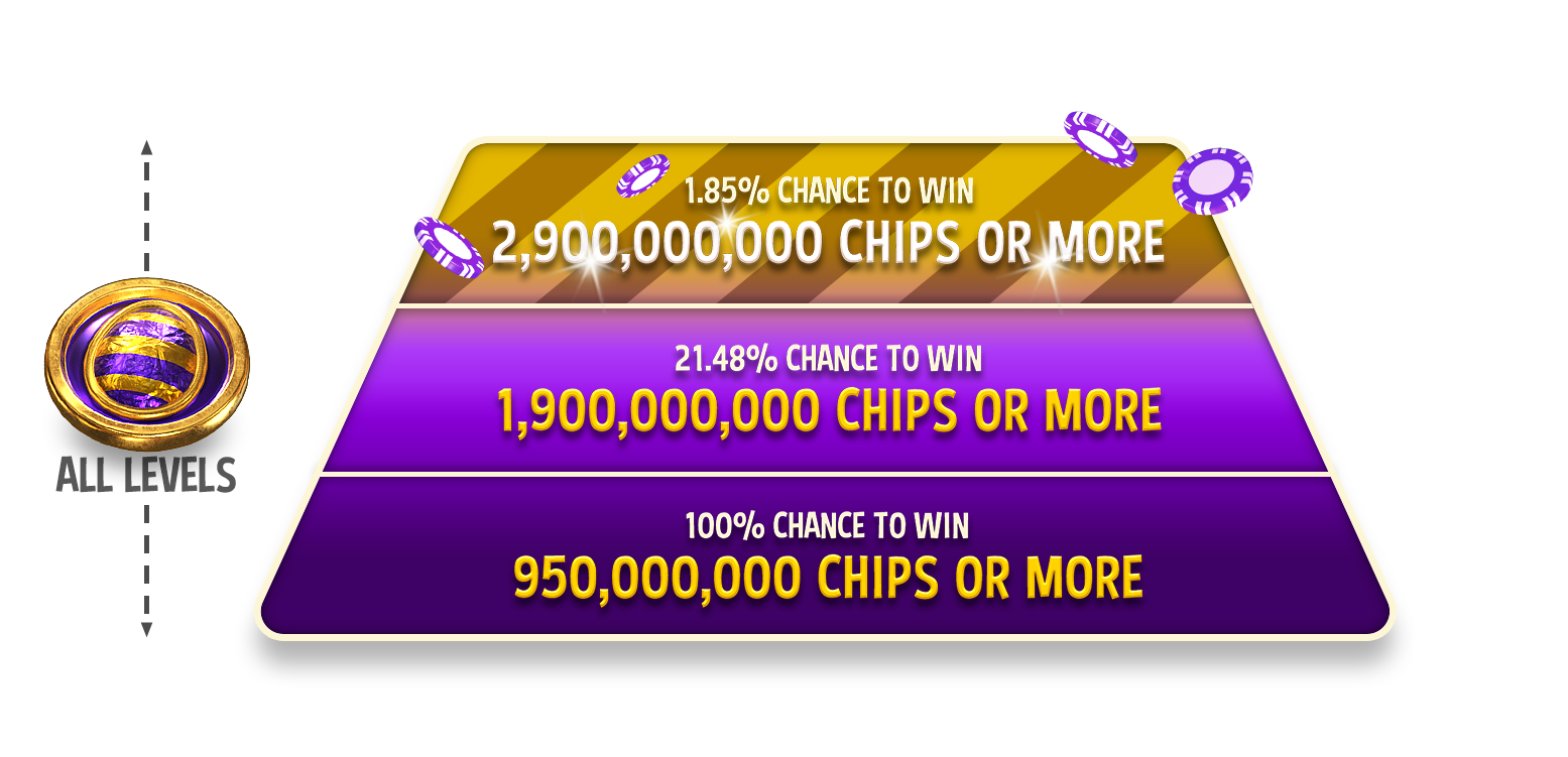Questo Spin è uno degli spin coi premi più alti ed è disponibile solo per un periodo di tempo limitato. La vincita minima è di 950 MILIONI DI FICHES e il jackpot è di 1,7 TRILIONI DI FICHES.