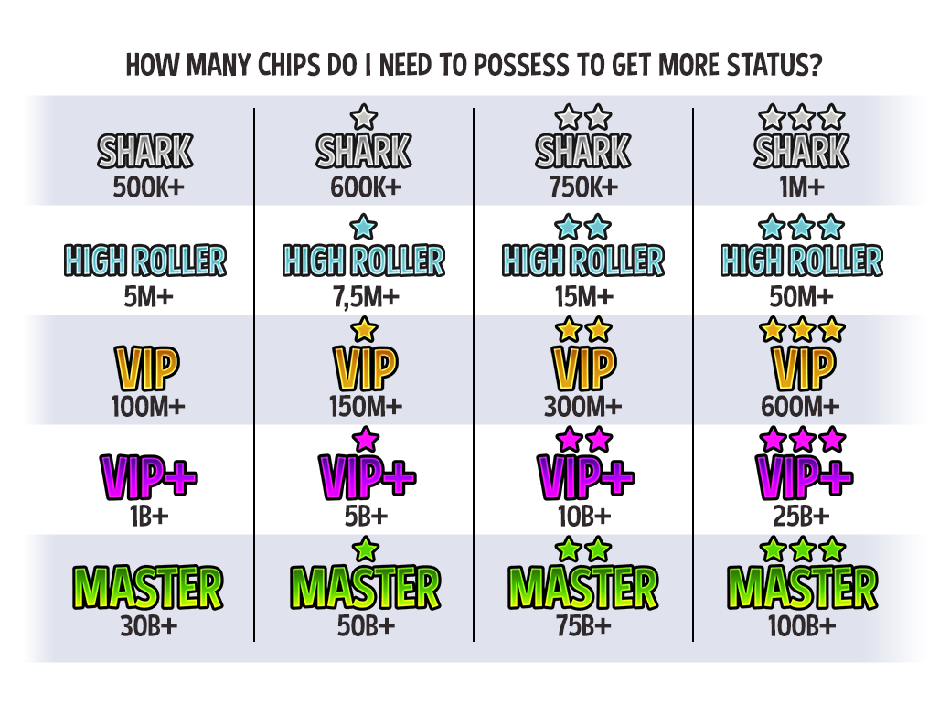 Als je boven een bepaald aantal fiches komt, ontgrendel je een titel. De titel kan echter verloren gaan wanneer uw chipbalans onder het minimumbedrag daalt dat voor die titel vereist is. Momenteel zijn de titels en hun vereiste chipbedragen: