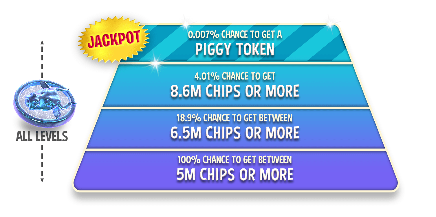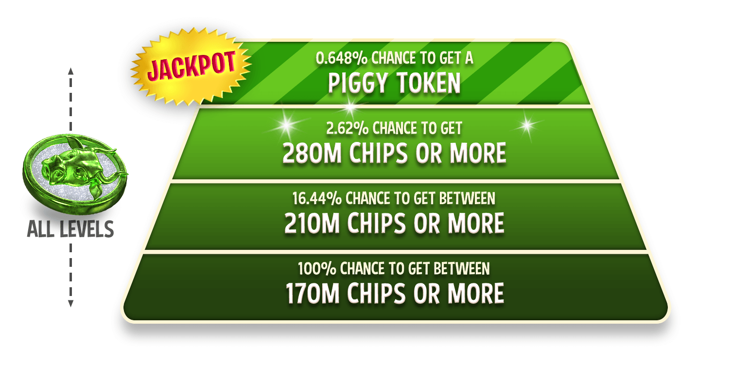 Aqui está uma lista dos prêmios em fichas que você pode ganhar: 710M, 740M, 780M, 850M, 880M, 920M, 990M, 1B, 1.1B, 1.2B, 1.3B, 2.1B, 7.1B, 14B, 35B, 71B, 140B, 350B, 500B